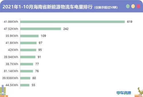 整体来看,2021年1-10月,海南省在新能源物流车领域,电量以41.86KWh、47.52KWh和35.9KWh的车型销量最多,其销量分别是619、242、109辆,占海南省前10月新能源物流车总销量的29.83%、11.66%、5.25%。