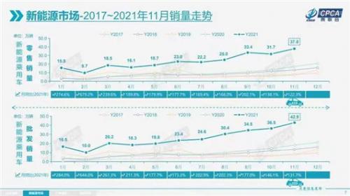 的确,随着“双碳”目标和节能减排观念的逐渐普及,潜在消费者对新能源车的接受度不断提高,使得今年国内新能源销量节节攀升,11月新能源市场的生产、批发与零售量更是均再次创下新高,分别为43.5万辆、42.9万辆和37.8万辆,其中前两者是首次突破40万辆。