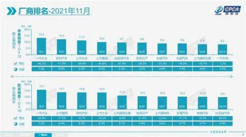 在零售榜单中,11月吉利汽车取得近年来的最好名次——亚军,比亚迪也首次冲进前5。