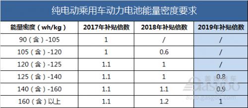 动力电池能量密度的补贴标准也是业界重点关注的对象之一,此次新政再次提高了纯电动乘用车电池能量密度的补贴标准门槛,由2018年最低105Wh/kg调整为最低125Wh/kg,而最高补贴倍数则由2018年的1.2倍降至1倍。