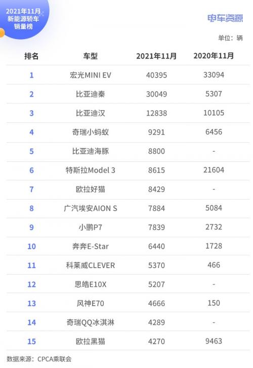 11月新能源轿车销量排行榜
