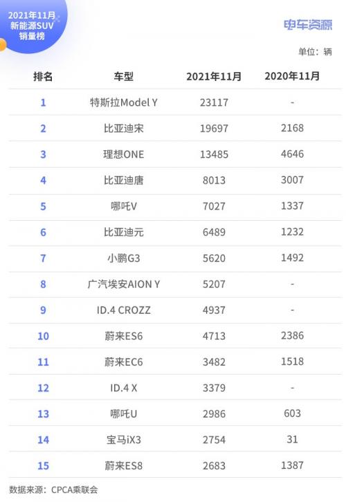 11月新能源SUV销量排行榜