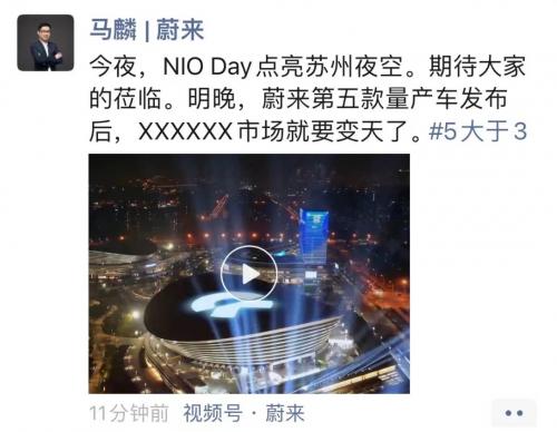 在NIO Day举办的前一天,ET5还没发布其实就引起了一阵“火药味”。蔚来企业传播高级总监马麟在其朋友圈发布了一条消息,称“蔚来第五款量产车发布后,XXXXXX市场就要变天了。#5大于3”