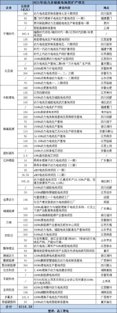 高工锂电据不完全统计,2021年动力电池投扩项目63个(含募投项目),投资总额超6218亿元,规划新增产能超过2.5TWh。