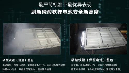 从试验结果来看,搭载弹匣电池系统安全技术的磷酸铁锂整包针刺相对普通整包,不冒烟且温度仅为51.1℃,是目前针刺热失控实验中表现最优的动力电池,刷新了磷酸铁锂电池的安全新高度。