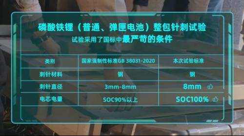 据了解,本次试验采用磷酸铁锂(普通电池)整包和磷酸铁锂(弹匣电池)整包进行对比测试。试验条件选择了国标最严苛的试验条件,即在8mm最粗钢针直径和100%SOC电量的条件下,进行针刺试验。