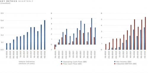 其中在2022年最后一个季度中,特斯拉实现了有史以来单季度最高营业收入、最高营业利润和最高净利润。2022年第四季度,特斯拉的营收为243.18亿美元,同比增长37%;毛利润为57.77亿美元,同比增长19%;毛利率为23.8%,低于第三季度的25.1%;营业利润率为16%,低于第三季度的17.2%;调整后息税折旧摊销前利润为54.04亿美元,同比增长32%;GAAP净利润为36.87亿美元,同比增长59%;营运现金流为32.78亿美元;自由现金流为14.2亿美元,同比下降49%。