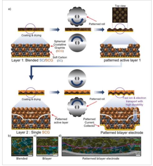 为了开发设计和加工技术,使锂离子电池在电极较厚的情况下保持高性能和可靠性,该团队构建了双层负极。此外,这种电极设计带有凹槽,可以在高容量材料之间放置小材料。这些小材料具有改善的离子导电性和导电性。