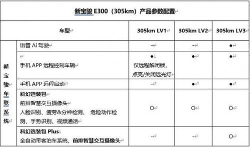 中国汽车新闻网讯日前,从官方获取到新宝骏E300以及E300Plus车型部分配置信息。新宝骏E300是新宝骏品牌首款新能源纯电动汽车,两座/三座的E300和四座的E300Plus续航均为305km,满足城市通勤与近郊等多种出行场景需要。两车均搭载车联网系统,通过在高配车型搭载APP远程启动、记忆泊车、全自动泊车等智能网联与智能驾驶功能,与入门级和中配车型形成产品配置的差异化。