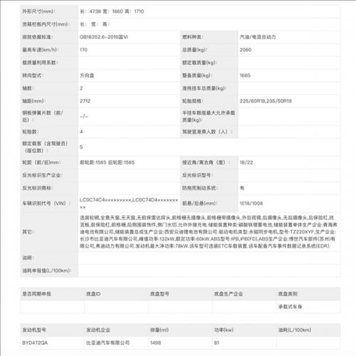 根据此前工信部申报的信息,车身尺寸方面新款更长更高,新款长宽高分别为4738/1860/1710mm,轴距为2712mm。作为对比,现款为4650x1860x1700mm,轴距保持不变。