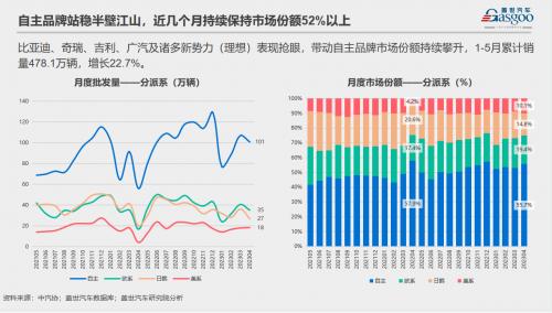 增换购需求在推动豪华市场保持稳定发展的态势,同时自主品牌稳居“半壁江山”,下图表格显示前五车企排名中,自主品牌占了四个,截至5月,比亚迪累计销量已经突破了100万台,持续保持销冠的位置。