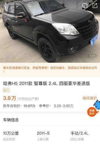 越野车友会的一个车友有辆哈弗H5要卖,我也想买辆便宜点的硬派越野车来玩玩,就问了一下,他说这台哈弗H5是2011年上牌的2.4L四驱版,说3.8万元可以卖给我。我在网上查了一下,这台车的市场价格在3.28万元到3.85万元,看来它卖给我的也是个市场价,我也不在乎那么多,关键是车况好就行,他还跟我保证说车肯定没问题。
