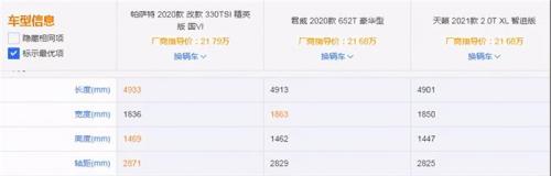 虽然配置在消费者的购车顺序中排名并不高,但配置的丰富与否对于日后用车便利性具有较大影响。我分别选取了售价21.79万的帕萨特330TSI精英版、售价21.68万元的君威652T豪华版以及售价21.68万元的天籁2.0T XL智进版。