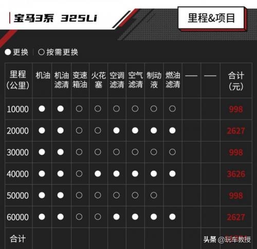 宝马3系依然遵循小保大保的保养顺序,间隔同样为1万公里,其中小保为常规的机油、机油滤芯器,在6万公里之前小保基本就这样。至于大保方面,宝马3系的“大保时间”比奔驰C级来得更造,是在4万公里的时候,项目多出了各种滤芯器、制动液以及火花塞,其余公里数大保项目差异不大。