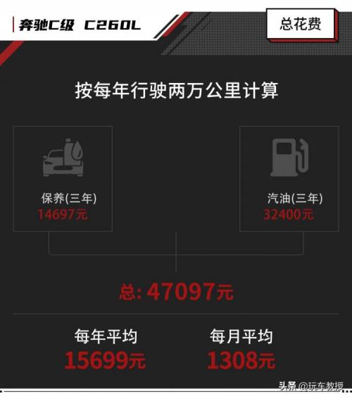 结合两项支出金额,奔驰C级C260 L三年6万公里保养费油费=47097元,平均每年15699元,平均每月1308元。