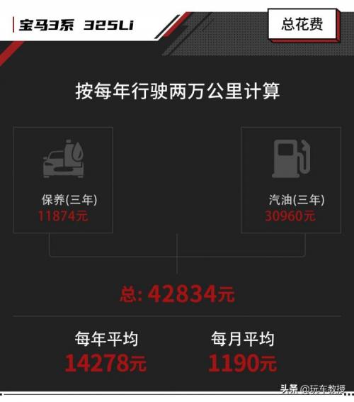 总费用来看,宝马3系三年6万公里的保养费用(不含变速箱油)油费=42834元,平均每年14278元,每月1190元。