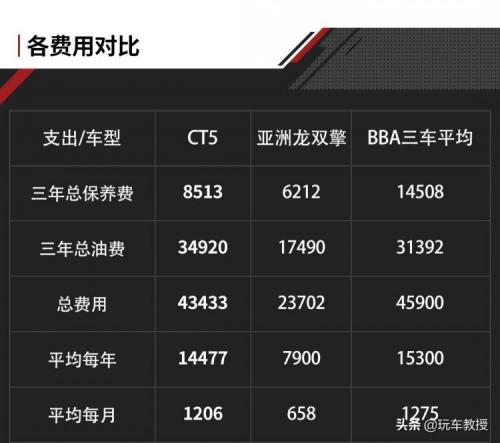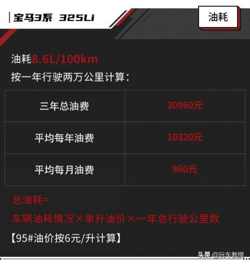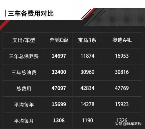 还是那个道理,虽然油耗、油价和在哪里保养都会对上述的结果有影响,但正是因为各种条件的不一致,故采用官方推荐保养项目和车主平均油耗来计算、比较。从这个表格能发现,其实三台30万级BBA在这两方面的支出都很接近,月花费基本在1200-1300元左右。