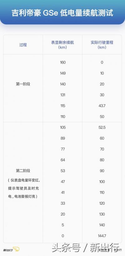 成绩总结:1、通过测试的第一阶段,我们实测帝豪GSe在剩余续航里程160km的低电量状态下,续航能力非常准确,没有缩水。2、以电表灯亮为节点进入第二阶段,最终全程跑了144.7km,减去第一阶段的52.5km,帝豪GSe在电表灯亮后实际能行驶92.2km。