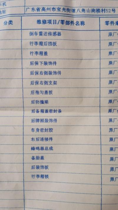 大家好,我是粤西小李,前两天我已经把我被追尾的车放在维修店维修,修好了,提回来了,然后维修店告诉我,一共花了13000多,有很多人怀疑,就换个后盖箱,和防撞梁,怎么可能要花那么多钱?就3000块钱都多了,今天我给大家看一下维修的项目和零部件。