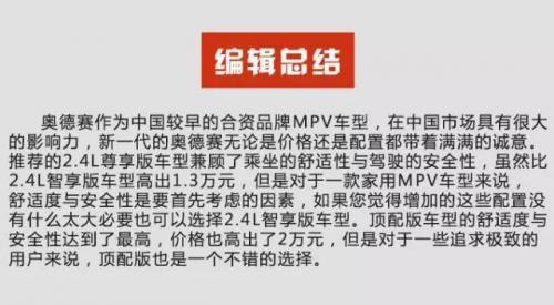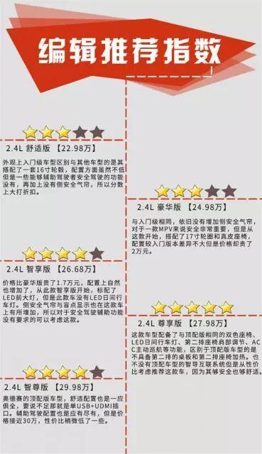 对于一款MPV车型来说,前排与后排乘客的乘坐舒适度是要考虑的重要因素之一,推荐的2.4L尊享版车型便是很好的兼顾了舒适度与性价比。与2.4L智享版相比,多出了第二排座椅肩部调节,第二排车窗遮阳帘,以及第二排航空座椅带靠背、坐垫联动调节。顶配版车型所有的舒适性配置一应俱全,但是价格也随之增加了2万元,追求极致的消费者可以选择购买。