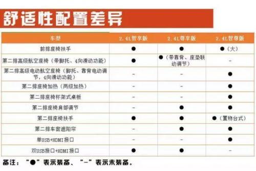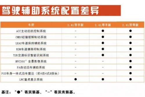 外观配置差异基本不大,但是2.4L尊享版标配了LED日间行车灯与转向照明系统为该车加了不少分,这两项功能可以为行车安全起到有效的辅助作用。