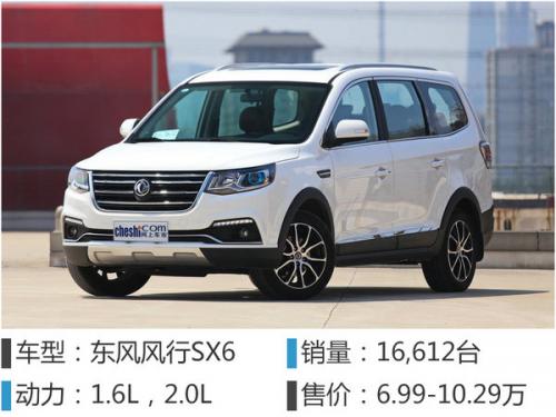 在人们的印象中,东风风行一直是扎根于商务MPV市场。眼见国内的SUV热潮高烧不退,风行也推出了首款SUV-SX6。SX6的长宽高分别为4660*1810*1790mm,轴距为2750mm。座椅布局为2+2+3。搭配1.6L和2.0L发动机配合5速手动变速器和CVT变速器。其11月的单月销量为8,455台,上市后累计销量为16,612台,平均月销4,153台。