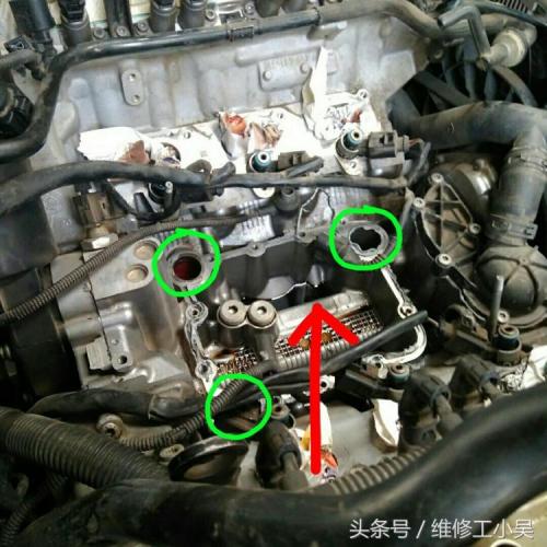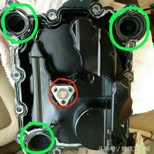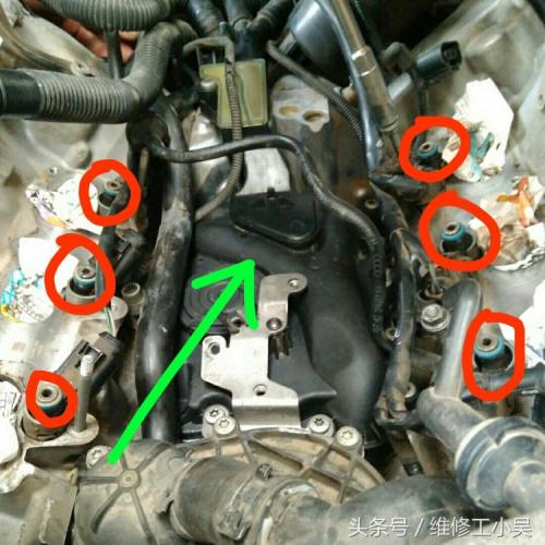 下图是汽修师傅把新的废气阀安装之后的情况!红色区域所示的是高压喷油嘴,绿色箭头所指的是新的废气阀!