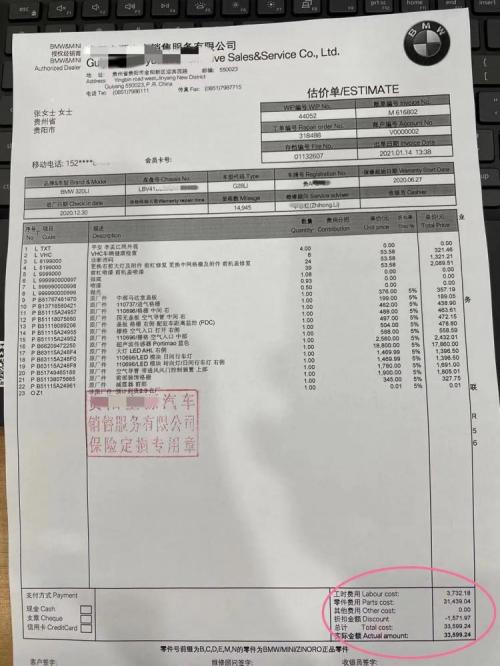 结果到了4S店定损时,金额远远超出了之前预估的3万以内的价格。后来保险定损员去现场砍掉了部分费用。