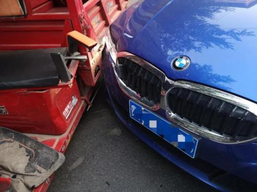 细节图,我方右边车灯受损,前机盖变形,中网有破损。对方为农用无牌三轮车,边上都是铁方条子,皮糙肉厚。