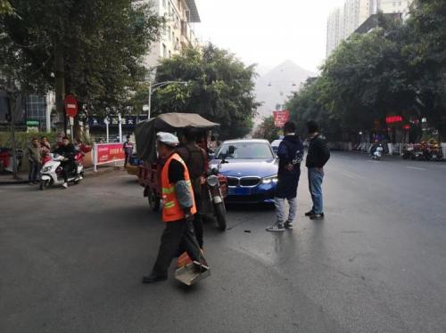 在经过一个无人看守并且无信号灯的十字路口时,突然路边冲出来一个三轮车,她同事慌了没刹住,就怼上了。