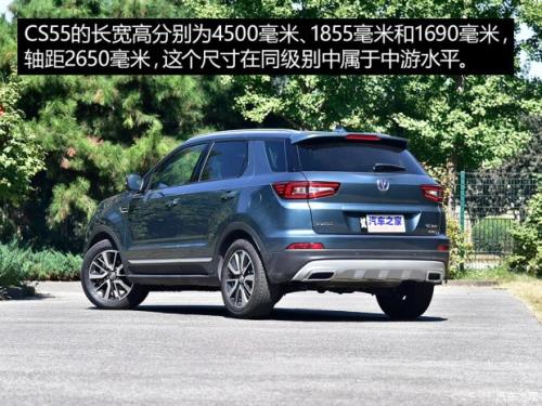 从名称上一看也能知道,这款车虽然和CS75一样定位在紧凑型SUV,但尺寸上应该会小一些。CS55的长宽高分别为4500毫米、1855毫米和1690毫米,轴距2650毫米,这个尺寸在同级别中属于中游水平,跟瑞虎7啊、vv5什么的大体上差不离。