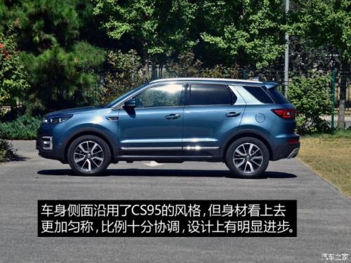 来到车身侧面,是我最喜欢的部分,设计与CS95类似,较粗壮的C柱和隐藏式的B、D柱形成了类似悬浮式的车顶,时尚。原本大家对CS95的外形设计评价褒贬不一,但在这辆车上就成熟了很多,我想这其中也有一部分原因在于CS55的车身略小使得比例更加协调,身材更匀称。
