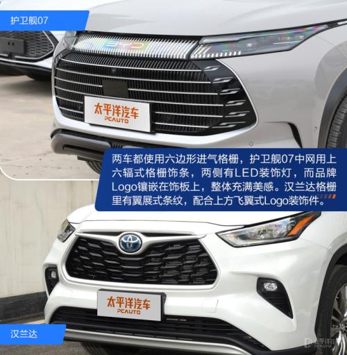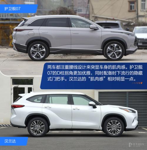 护卫舰07延续了X DREAM概念车的轮廓造型,偏方正的车身搭配大面积的中网设计更显魁梧,所以海洋美学这套设计语言能同时把SUV的魁梧感和当下流行的时尚感很好地结合在一起。而汉兰达则是走沉稳硬朗路线,通过一些线条塑造出肌肉感,偏向美式设计风格。