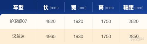 车身尺寸方面,护卫舰07长宽高分别为4820/1920/1750mm,轴距为2820mm,汉兰达5座版的车身尺寸为4965/1930/1750mm,轴距长度2850mm,两者之间三围数值的差距其实不算太多,那么汉兰达领先一点就说明空间大吗?留到后面的空间对比就知道。