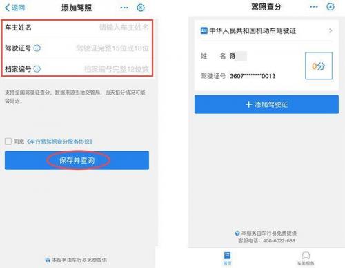 第二步:添加驾照,按照提醒填写车主姓名、驾驶证号、档案编号,保存查询即可。