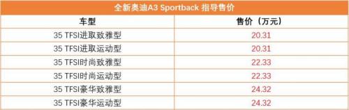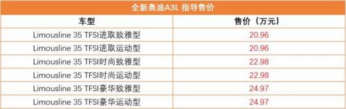 日前,我们从相关媒体获悉,国产全新一代奥迪A3家族正式上市。其中,全新奥迪A3 Sportback(两厢标准轴距版)共推出6款配置车型,售价区间为20.31-24.32万元。而全新奥迪A3L Limousine(长轴三厢版)共推出6款配置车型,售价区间为20.96-24.97万元。关于车型详细信息及价格,见下图: