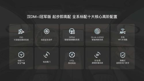 除此之外,冠军版车型还在整体配置方面进行了升级,拿最入门的汉DM-i冠军版121KM精英型来看,售价仅有18.98万元,就标配了L2级的DiPilot智能辅助驾驶系统,和支持5G网络的DiLink 4.0智能网联系统。还有像3D全息透明影像系统、电动尾门、VTOL外放电功能、11个安全气囊等等一些日常使用率比较高的功能配置,大幅提高车辆使用的便利性和安全性,这些一直是汉这种中国品牌车型,相比合资同价位车型的优势所在。
