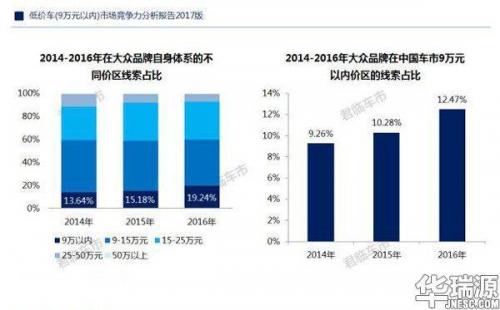 过去三年即2014年、2015年、2016年,大众9万以内的低价车越来越受宠,分别占自身线索总量的13.64%、15.18%、19.24%,其过去三年的线索分别占该细分车市总量的9.26%、10.28%、12.47%。大幅领先于宝骏、吉利、长安、现代、丰田等品牌。