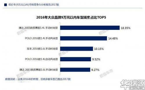 取得这样的成就,捷达、POLO、桑坦纳等老将功不可没,而宝来、速腾、高尔夫等车型的加入也是其主要推动力量。在2016年大众9万元以内具体车型的线索占比TOP5中,捷达、POLO等的手动挡都非常受欢迎。虽然目前大众多数低价车型是2017款,但指导价大体维持原价,如再考虑经销商的降价促销,大众低价车的线索占比还有很大的提升空间。