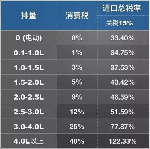 另,2018年7月1日之后,国内汽车关税下调至15%,此前增值税也从17%下调至16%,综合税率见下表。