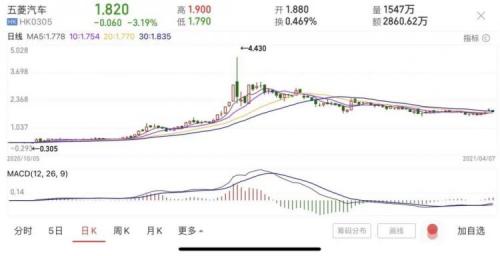 五菱宏光MINIEV上市后,成为新能源汽车销量冠军,助推上汽通用五菱新能源汽车市占率成为国内第一,五菱汽车也被视为供应链企业而受到市场追捧。2020年10月前,五菱汽车股价0.35港元,后续持续上涨,最高涨至2020年12月28日的4.43港元。随后逐步下跌,目前报价为1.82港元。
