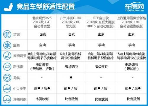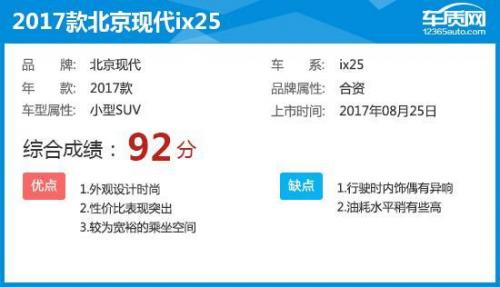 2017款北京现代ix25与竞品车型相比,动力表现略占下风,同时部分科技性配置的缺失令其在竞争力方面稍显不足。不过丰富的被动安全配置可以确保车内人员安全,舒适性配置也能够满足普通消费者所需,并且由于现款现代ix25正处于产品周期末端,目前有着较为可观的优惠幅度。
