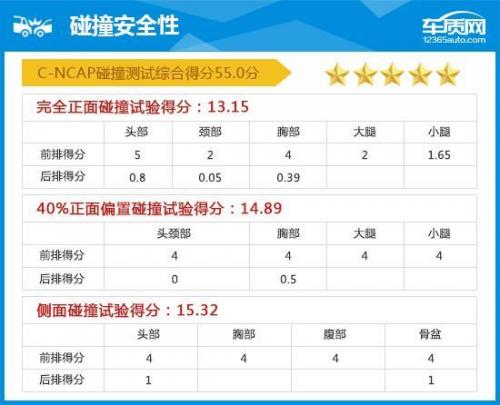 根据国内C-NCAP碰撞测试数据显示,北京现代ix25获得五星评价,得分达到了55.0分。在完全正面碰撞、40%正面偏置碰撞测试中,前后排乘客的保护全面,失分项很少,几乎为满分通过,而在后排乘客在碰撞测试过程中可以发现头部和颈部的保护欠佳。而在侧面碰撞实验中,现代ix25以满分成绩通过测试。