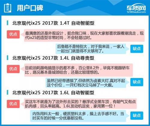 在用户口碑中,大部分消费者还是对北京现代ix25的外观设计赞美不已,采用了常规造型的ix25虽然细节没有过多夸张之处,但双色车身配搭以及整体线条对车身的勾勒,使其有着极为硬朗和时尚的视觉效果,尤其受年轻消费者喜爱。除此之外,优秀的动力调校也深受好评。不过,也有部分车主认为车内用料方面硬质塑料太多,而全系标配卤素光源大灯也令部分购买中高配车型的消费者感到不满。