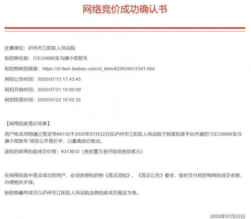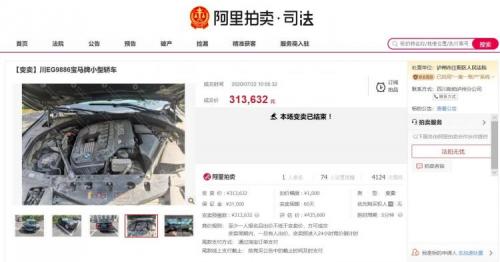 2020年7月22日10:05,经过1次应买,车牌号为川EG9886的宝马730Li,以313,632元的价格在阿里拍卖平台拍卖成交。其中该车辆评估价为435,600元,成交价低于评估价10万余元。整场变卖共吸14人参与报名,74人设置提醒,共有4124次围观。