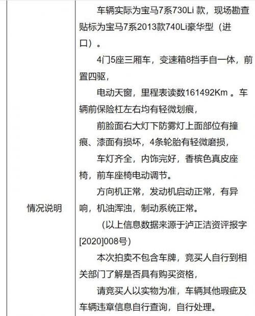 被变卖的这辆宝马730Li,是由泸州市江阳区人民法院作为处置单位,在阿里拍卖平台进行变卖的。车辆车牌号为川EG9886,变卖价为313,632元,保证金为31,000元,加价幅度为1000元。需要注意的是,本次拍卖标的物不含车牌。