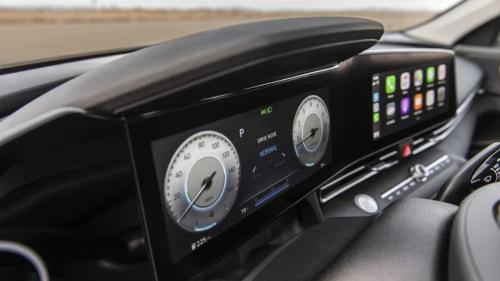 全新一代伊兰特使用了现代家族最新的四辐造型方向盘,采用皮质+金属装饰,预计会带来不错的手感。同时新车还配有10.25英寸全液晶仪表,贯穿式设计的空调出风口,以及CarPlay功能。从设计布局可以看出,常规的功能性操作还是十分便利的。