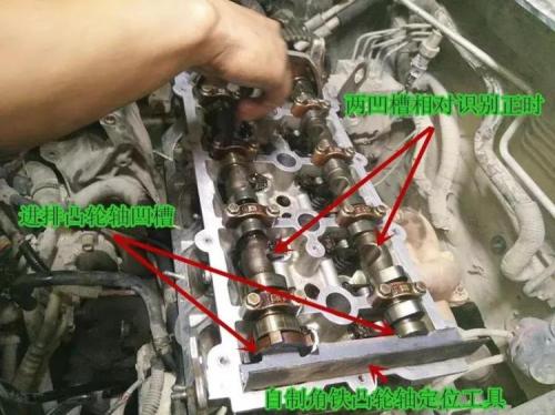 ①摇到进排两凹槽相对时,凸轮轴定位工具才能卡进去。