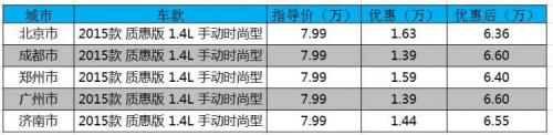 作为A级车的热销车型,新捷达的性价比和实用性自然不必多说。近日,底价神探从各地经销商了解到大众捷达现车销售,颜色丰富可选,目前北京市2015款质惠版1.4L手动时尚型为全国优惠最低车型,降幅达到了1.63万元,其他降幅前五城市及车型请见下表,感兴趣的消费者可以到店咨询。
