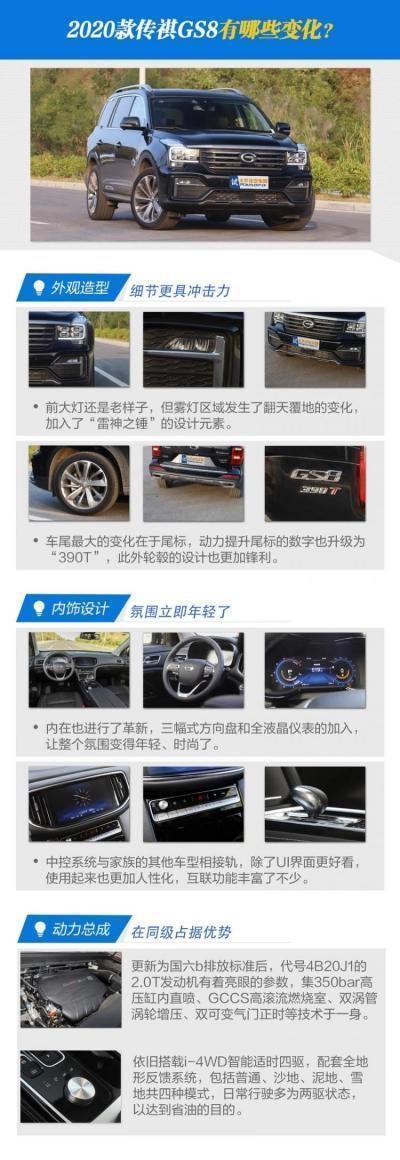2020款传祺GS8(以下简称:新传祺GS8)已经在今年10月中旬正式上市,一共有8款车型可选,全系标配了第三代390T发动机(2.0T)和爱信6速手自一体变速箱,低配车型为5座版本,高配车型搭载博格华纳第二代i-4WD智能四驱系统。